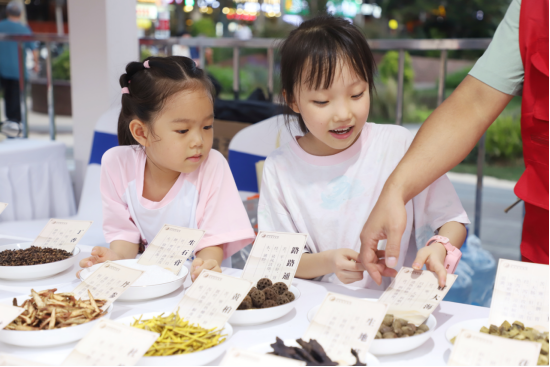 草药辨识区吸引了众多亲子家庭。丁香、杜仲、茯苓、黄芪、五味子等36种中药饮片与7种中药原药材供市民亲自观察、触摸。